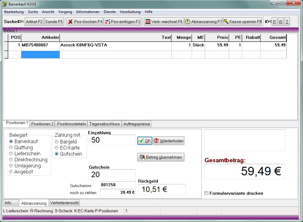 Zahlarten (Bar, Karte, Gutschein) Zahlarten können kombiniert
